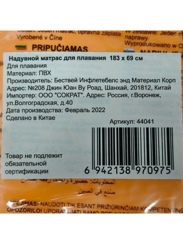 Покупка матраса для плавания Bestway 183х69 см — это возможность наслаждаться отдыхом на воде в любое время. Экономия времени на подготовку к отдыху, легкость использования и долговечность делают такой выбор выгодным для каждого, кто ценит комфорт и яркие эмоции. Продукция Bestway — это гарантия качества и отличного настроения на весь сезон!