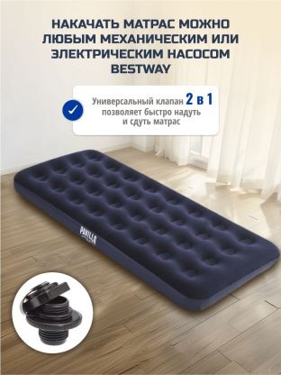 Матрас оснащен универсальным клапаном для накачивания и сдувания - подойдет любой тип насоса: ручной, ножной, электрический. Клапан не закручивается. Клапан вставляется в отверстие, герметично его закрывая.