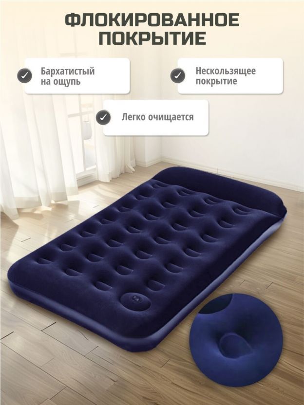 Надувной матрас может заменить громоздкую и занимающую много места раскладушку, что особенно полезно при приёме гостей или в условиях ограниченного пространства квартиры. Его также возможно использовать для отдыха на природе: он легко помещается в багажник автомобиля и обеспечивает комфортный отдых на свежем воздухе. Товар поставляется в полной комплектации, приобретение отдельных элементов не представляется возможным.Матрас оснащен встроенным механическим ножным насосом, который позволяет за несколько минут надувать и сдувать матрас.