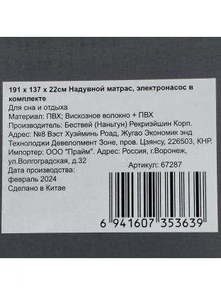 Матрас надувной Bestway, 191х137х22 см, 67287/004427BW, насос внешний, электрический, флокированный, 300 кг