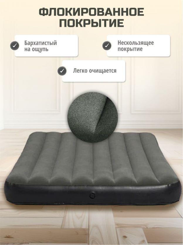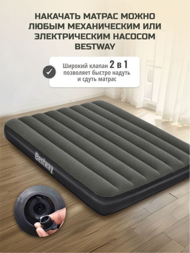 Матрас Bestway, выполненный из прочного флокированного винила, обеспечивает комфортный и здоровый сон в любых условиях. Его уникальная конструкция позволяет ему сохранять форму даже при неравномерном распределении нагрузки. Этот матрас легко надувать и сдувать, что делает его прекрасным выбором для путешествий или отдыха на природе. Кроме того, он может служить дополнительным спальным местом в квартире или доме. Если пространство ограничено, надувные матрасы становятся отличным решением для размещения гостей. Всё, что нужно сделать, - это надуть матрас и разместить его в свободной комнате.