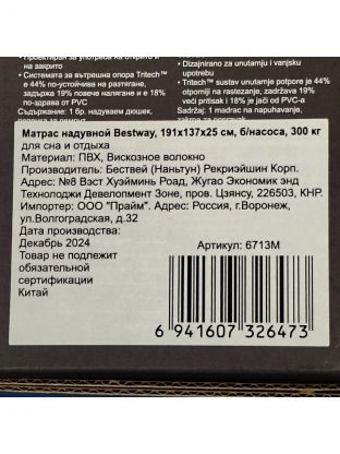 Матрас надувной Bestway, 191х137х25 см, Tritech Air, 6713M, без насоса, флокированный, 300 кг