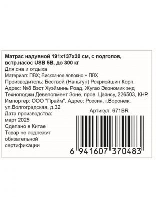 Матрас надувной Bestway, 191х137х30 см, 671BR, насос встроенный, USB 5B, флокированный, 300 кг