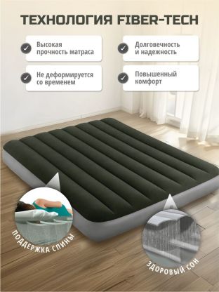 Вместо традиционных перегородок из ПВХ, Intex использует большое количество высокопрочных волокон, что предотвращает их растяжение и деформацию в процессе использования. Благодаря этому, матрас не проминается и не продавливается, обеспечивая здоровый и комфортный сон.