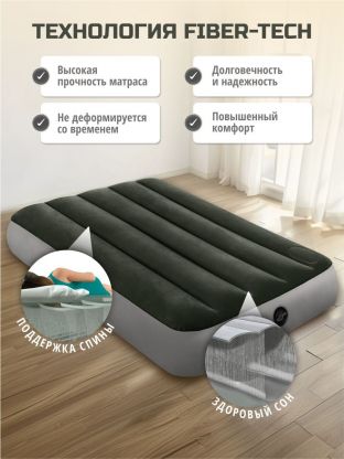Вместо традиционных перегородок из ПВХ, Intex использует большое количество высокопрочных волокон, что предотвращает их растяжение и деформацию в процессе использования. Благодаря этому, матрас не проминается и не продавливается, обеспечивая здоровый и комфортный сон.