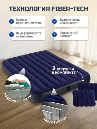 Вместо традиционных перегородок из ПВХ, Intex использует большое количество высокопрочных волокон, что предотвращает их растяжение и деформацию в процессе использования. Благодаря этому, матрас не проминается и не продавливается, обеспечивая здоровый и комфортный сон.