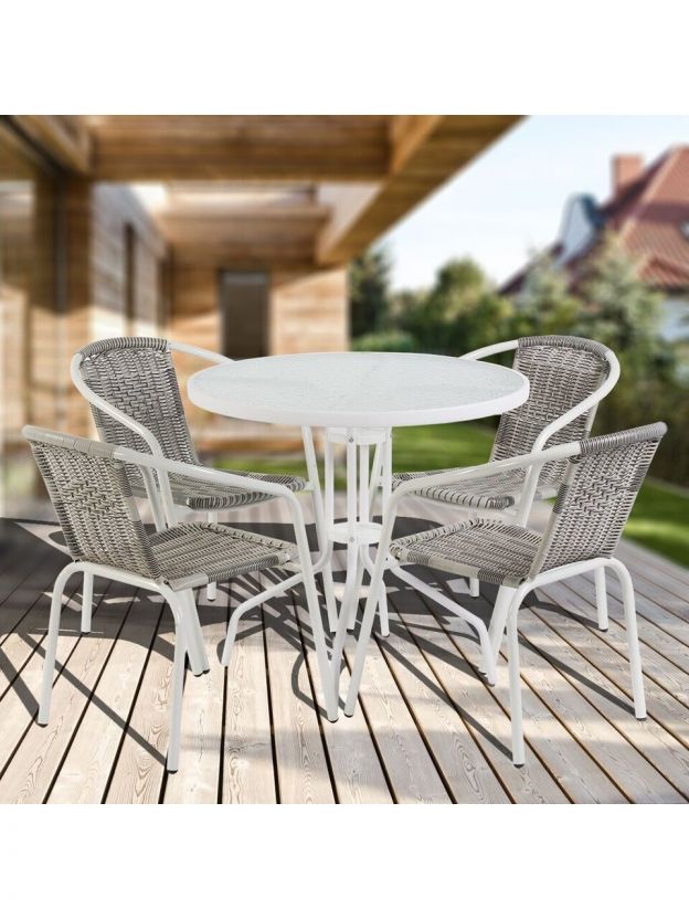 Мебель садовая "Бирма" включает в себя круглый стол и четыре удобных стула, которые создают гармоничное сочетание для отдыха на свежем воздухе. Белый цвет комплекта добавляет легкости и свежести в любой интерьер, будь то сад, дача или даже кафе. Этот набор предназначен для использования на улице и в помещениях, что делает его универсальным решением для различных пространств.