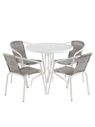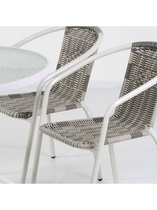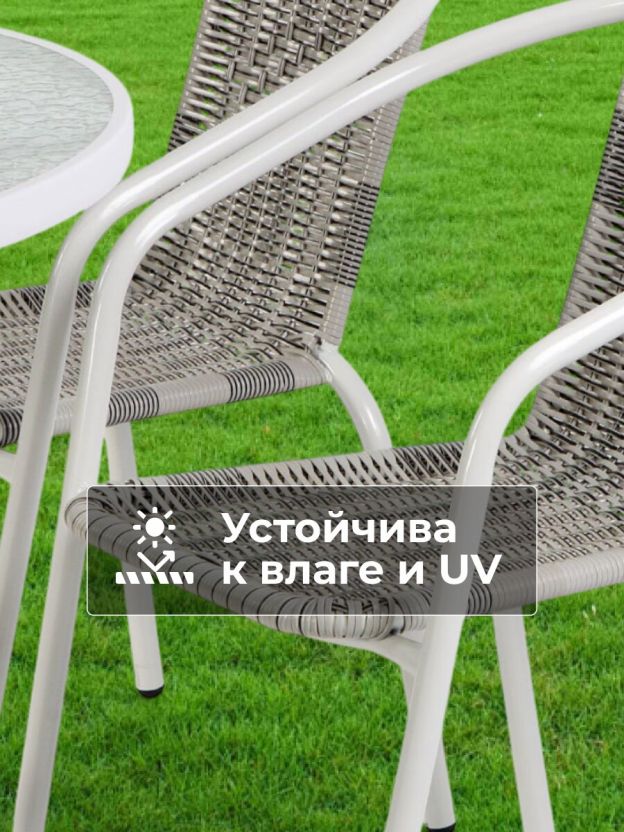 Комплект выполнен из материалов, устойчивых к любым погодным условиям, что гарантирует долговечность и надежность. Благодаря водонепроницаемости, мебель не боится дождя и влаги, а жесткие сиденья и подлокотники обеспечивают комфортное времяпрепровождение. Набор не имеет складной конструкции, что обеспечивает его устойчивость и прочность.