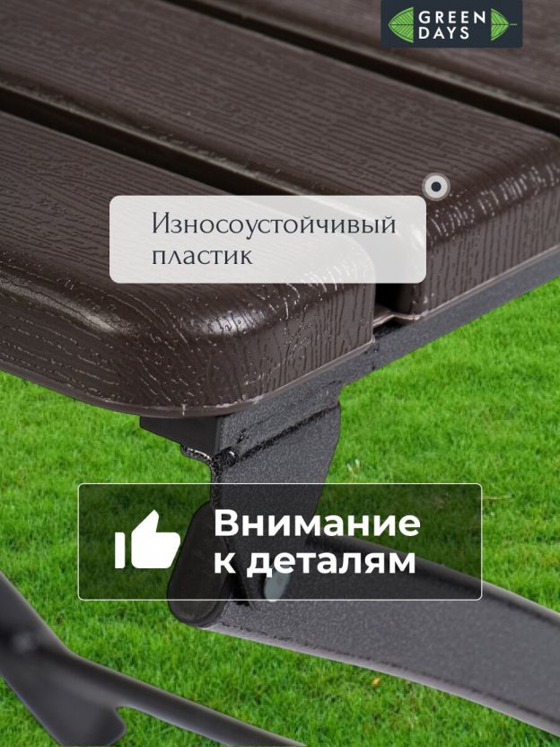 • Столешница выполнена из высококачественного пластика, при этом имеет оригинальную комбинацию текстур под ротанг и дерево, материал обладает высокой надежностью, устойчив к выгоранию, не поддается коррозии и обеспечивает всей конструкции легкий вес.