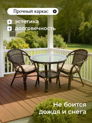 Стильная ротанговая мебель станет настоящим украшением сада, приусадебного участка, беседки или веранды. Комплект мебели Мария также идеально впишется в интерьер загородного дома или городской квартиры, создав уютный ансамбль в гостиных и столовых комнатах. Обратите внимание: товар поставляется в полной комплектации, приобретение отдельных элементов не представляется возможным.