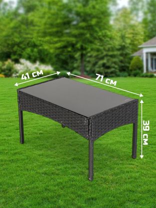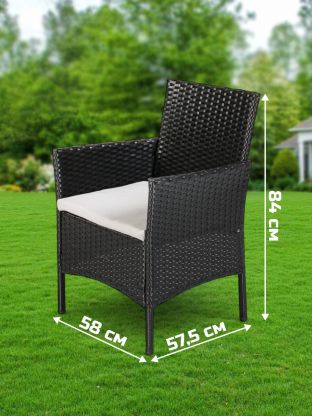 Садовая мебель "Миранда" включает в себя все необходимое для создания комфортной зоны отдыха: стол размером 71х41х39 см, два кресла размером 57.5х58х84 см и диван размером 101х58х85 см. Черный цвет каркаса в сочетании с серыми подушками придает комплекту современный и стильный вид, который прекрасно подходит для любого двора или сада.