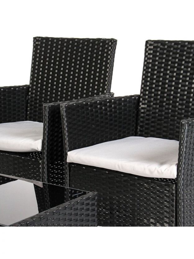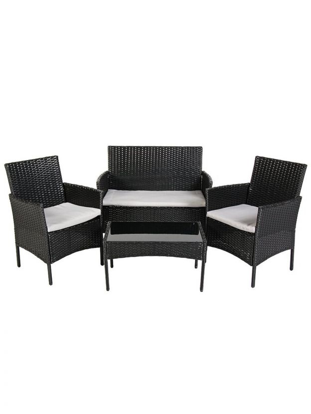 Мебель садовая Миранда, черная, стол, 71х41х39 см, 2 кресла, 1 диван, 150 кг, 57.5х58х84 см, серые подушки, 101х58х85 см