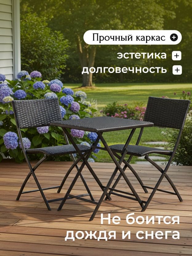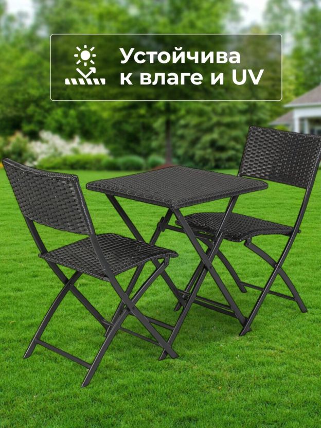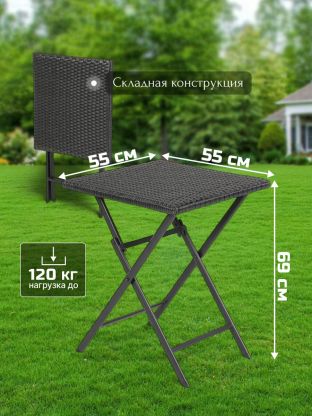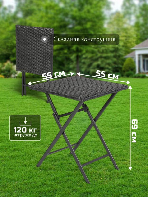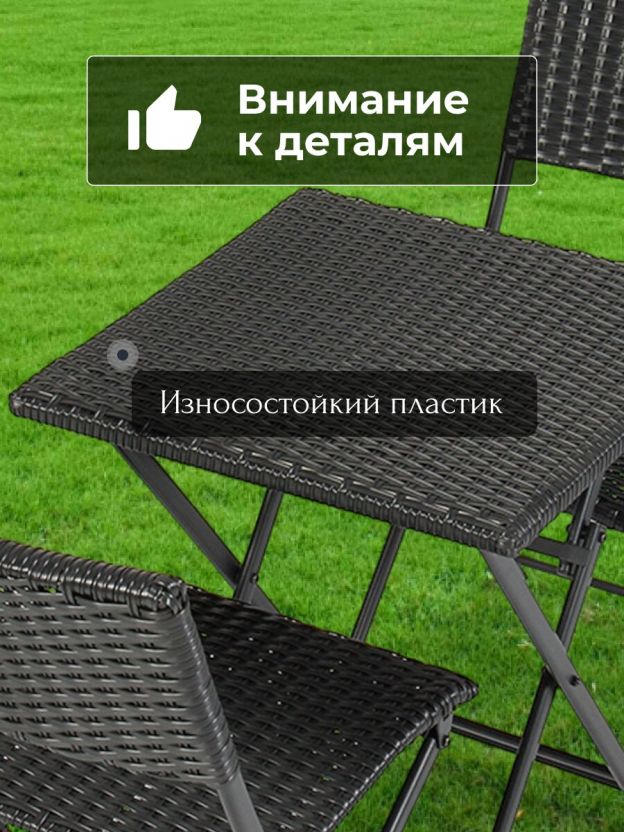 Мебель отличается прочным стальным каркасом и жестким сиденьем, что обеспечивает надежность и долговечность в ежедневном использовании. Максимальная нагрузка как на стол, так и на стулья составляет 120 кг. Складная конструкция упрощает хранение и транспортировку, позволяя быстро освободить пространство или взять комплект с собой на пикник или кемпинг. Благодаря универсальности, мебель подходит для различных целей: от семейных обедов на свежем воздухе до организации комфортной зоны для отдыха в кафе или на даче.
