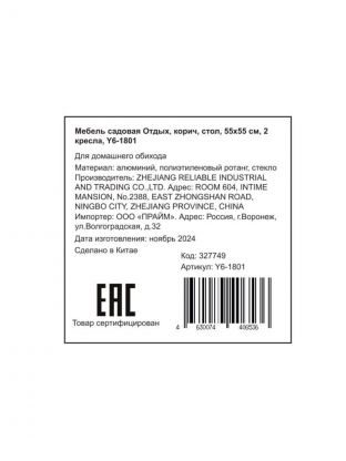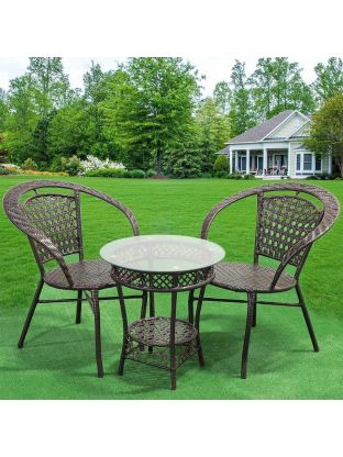 Комплект состоит из двух комфортабельных кресел и небольшого столика со стеклянной столешницей. Мебель выполнена из высококачественного искусственного ротанга методом плетения. Искусственный ротанг - это современный материал, прекрасно адаптированный к российскому климату. Так что эту мебель можно с легкостью отнести к разряду уличной мебели, ведь ее высокая устойчивость к температурным перепадам и атмосферным осадкам позволяет устанавливать ее под открытым небом, не боясь потерь в эксплуатационных характеристиках и внешнем виде.