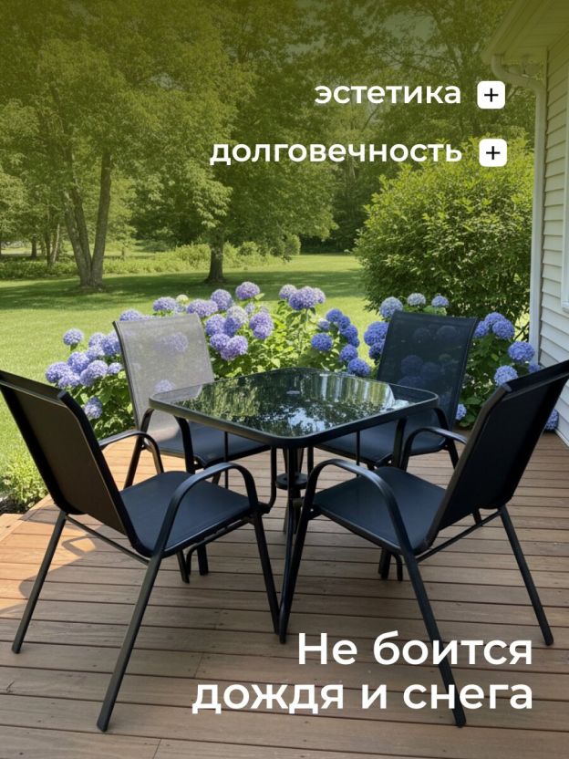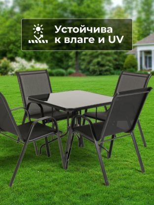 Садовая мебель Тиба — стильное и практичное решение для обустройства дачного участка, террасы, уличного кафе или домашней кухни. Современный дизайн и универсальный черный цвет гармонично впишутся в любой ландшафт или интерьер, подчеркивая вкус и заботу о комфорте. Комплект состоит из квадратного стола размером 80х80х70 см со столешницей из прочного стекла и четырех удобных стульев с жестким сиденьем (размер стула — 59х58х95 см). Такой набор рассчитан на комфортное размещение четырех персон, что идеально подходит для семейных обедов и дружеских встреч на свежем воздухе.