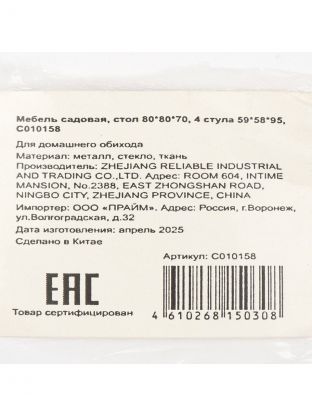 Мебель садовая Тиба, стол, 80х80х70 см, 4 стула, 110 кг, 59х58х95 см, C010158