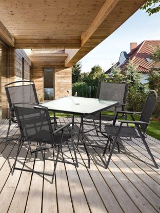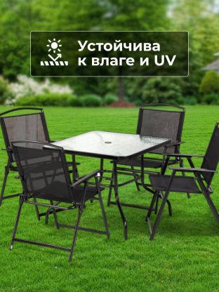 Комплект мебели Вилена обладает уникальной особенностью: в центре столешницы предусмотрено отверстие для зонта, что позволяет наслаждаться отдыхом на свежем воздухе даже в солнечные дни. Складная конструкция мебели обеспечивает легкость в хранении и транспортировке, что особенно важно для сезонного использования.