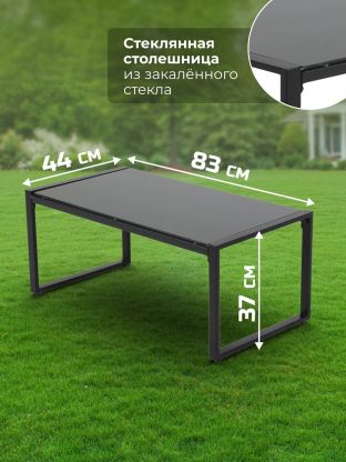 Столешница выполнена из закалённого стекла, устойчивого к механическим повреждениям и перепадам температуры. Это решение удобно для использования на улице и легко очищается.