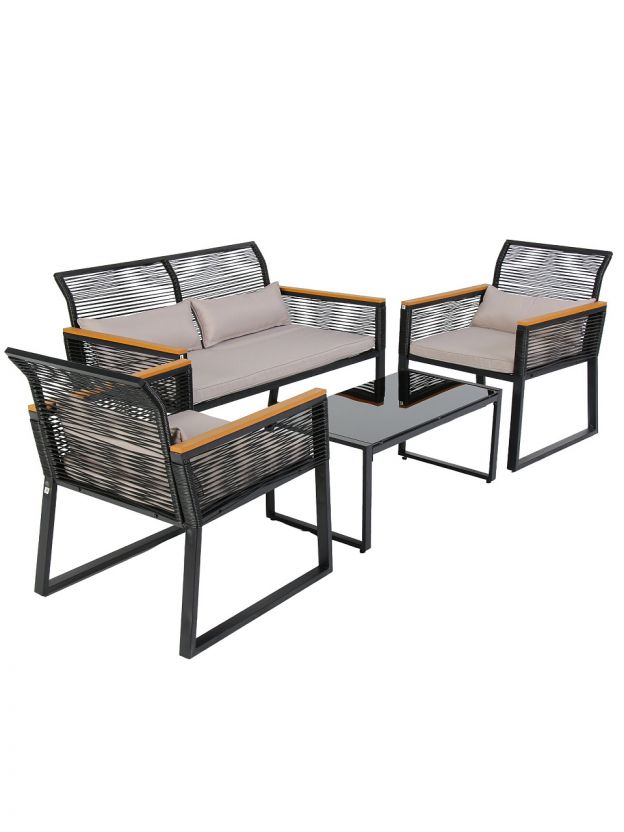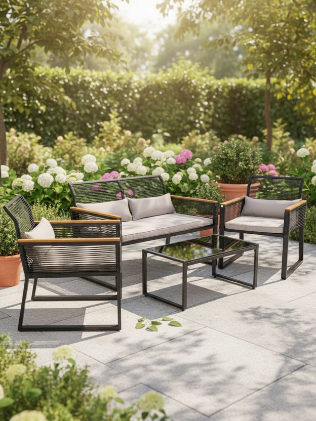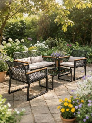 Ищете, какую садовую мебель купить недорого для дачи или террасы? Этот черный комплект включает стол с прямоугольной стеклянной столешницей, два стула и удобный диван с мягкой подушкой. Мебель рассчитана на 4 человек — идеальный вариант для семейных обедов или приёма гостей на свежем воздухе. Благодаря прочным материалам и современному дизайну, набор гармонично впишется в любой экстерьер, а стекло легко очищается от загрязнений.
