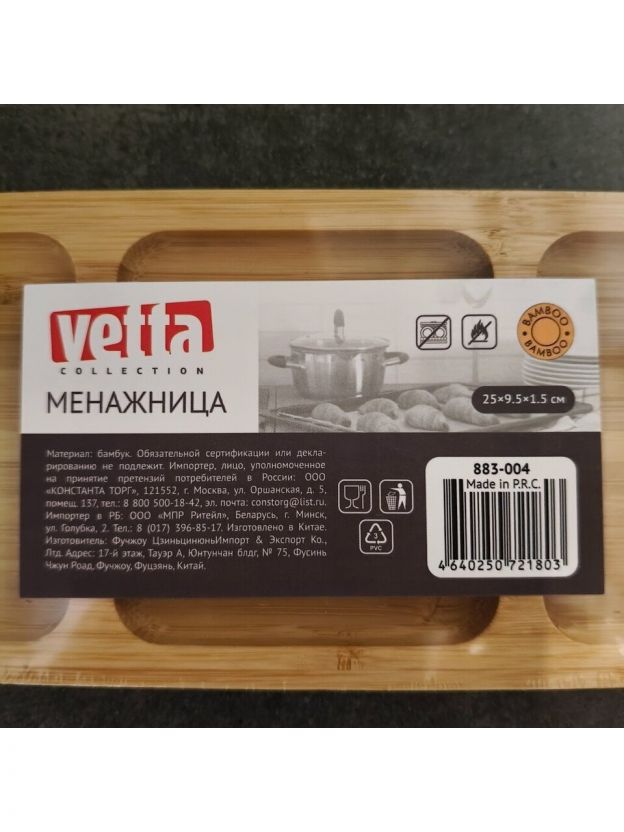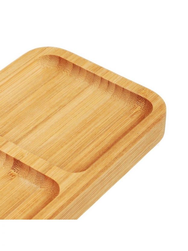 Менажница из бамбука Vetta — стильное решение для сервировки закусок, орехов, фруктов и соусов. Прямоугольная форма с тремя секциями позволяет удобно разделять разные продукты, сохраняя их вкус и свежесть. Натуральный бамбук придаёт изысканный вид и подчёркивает экологичность выбора. Компактный размер 25х9.5 см отлично впишется в любой интерьер кухни или дачи, а лёгкость ухода сэкономит время. Идеальный вариант для уютных ужинов и праздничных застолий.