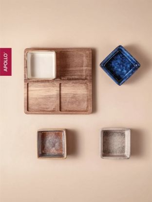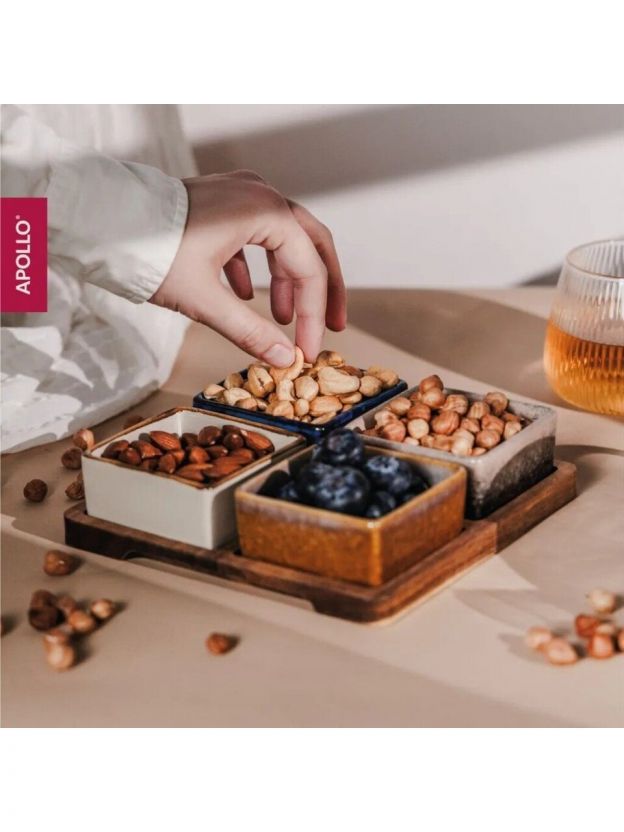 Менажница для сервировки, керамика, 19х19х1.5 см, 4 секции, 5 предметов, деревянная подставка, Apollo, Breeze, BRZ-06