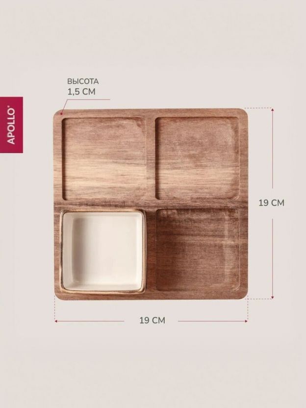 Менажница выполнена в компактном размере 19х19х1.5 см и включает в себя 4 секции, которые позволяют удобно разместить различные закуски и соусы. Это делает её незаменимой для сервировки разнообразных блюд, от свежих овощей до изысканных деликатесов. Деревянная подставка добавляет изделию особый шарм и прочность, обеспечивая устойчивость и удобство в использовании.
