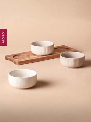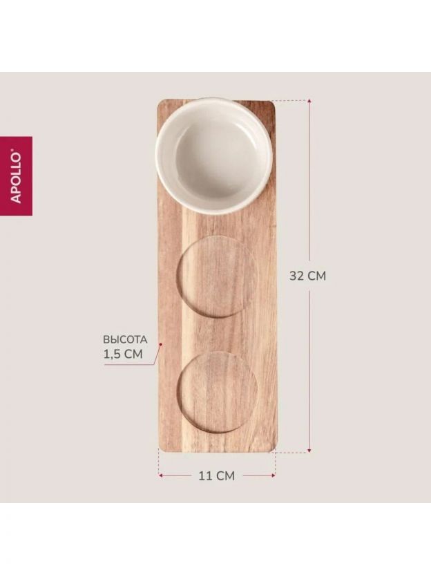 Менажница для сервировки, керамика, 32х11х1.5 см, 3 секции, 4 предмета, деревянная подставка, Apollo, Malpaso, MLP-03