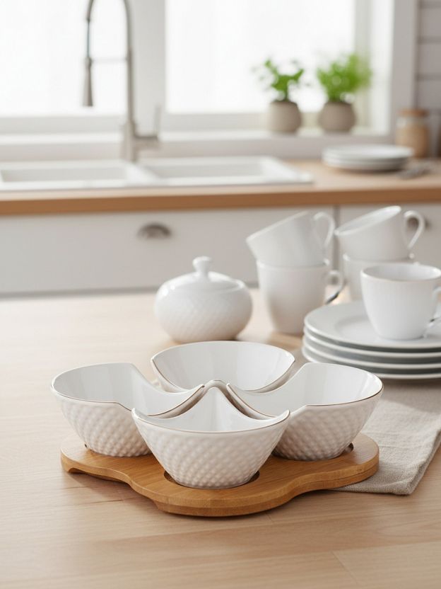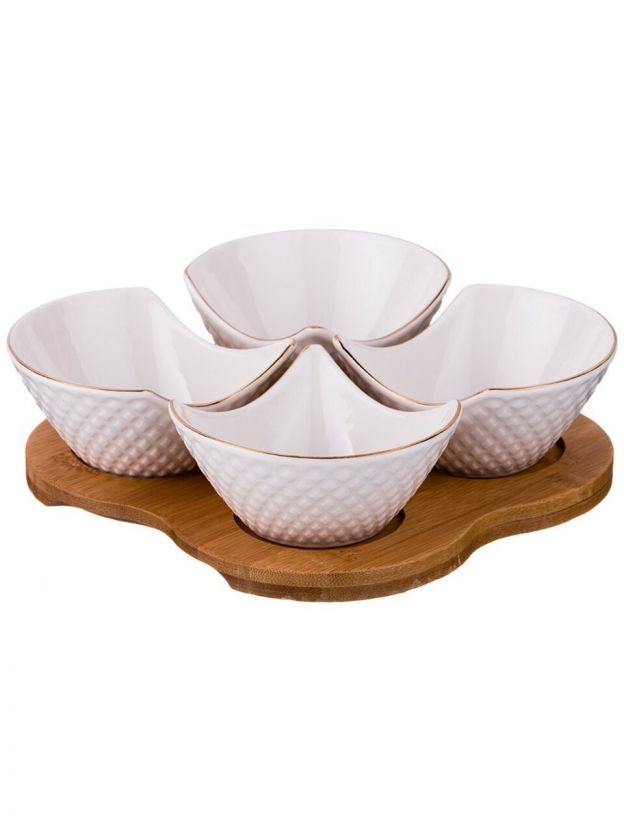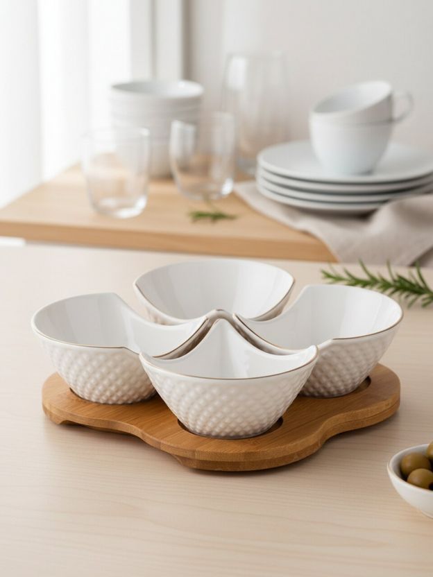 Менажница выполнена из прочного фарфора, устойчива к сколам и потере цвета. Подставка — из натурального дерева, обработанного для защиты от влаги.