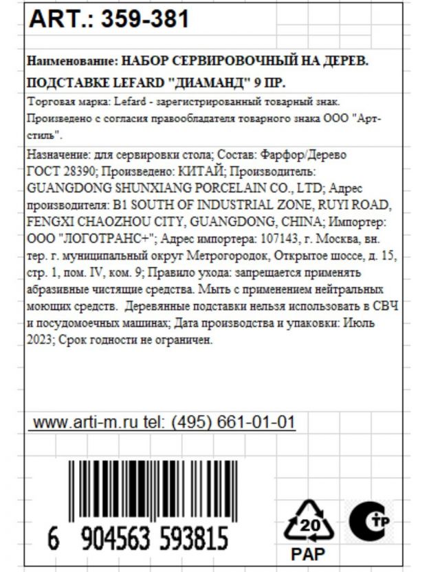 Размер менажницы — 18х18х5 см. В комплекте: фарфоровая менажница, деревянная подставка, 4 ложки. Артикул производителя: 359-381.
