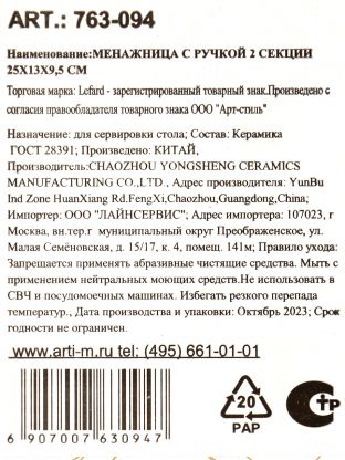 Менажница керамика, 25х13х9.5 см, 2 секции, с ручкой, Lefard, София, 763-094