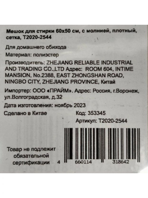Мешок для стирки 60х50 см, с молнией, плотный, сетка, T2020-2544