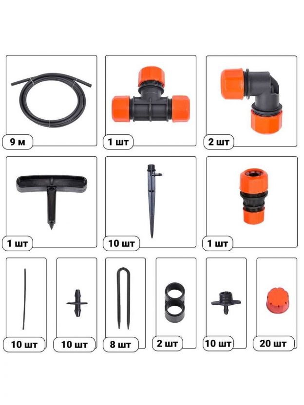 Длина шланга 9 метров обеспечивает удобную организацию полива на участке площадью до 4 м2, а подключение к водопроводу с диаметром 1/2 дюйма делает установку максимально простой и быстрой. Прочный пластик гарантирует долгий срок службы и устойчивость к перепадам давления до 3 бар. Комплект подходит для использования на даче, в саду, а также для полива декоративных и плодовых культур. Страна производства — Россия, что особенно актуально для условий отечественного климата.