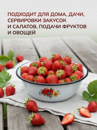 В отличие от пластика или стекла, эмалированная сталь устойчива к механическим повреждениям и не впитывает запахи. Если вы ищете, какую миску выбрать для ежедневного использования на кухне или для дачи, обратите внимание на этот вариант: он не подходит для СВЧ и посудомоечной машины, зато легко моется вручную и не боится перепадов температур. Дизайн с цветочным рисунком в стиле прованс впишется в любой интерьер и добавит уюта.