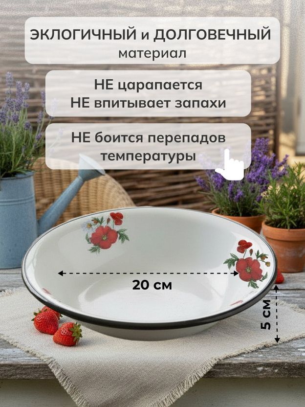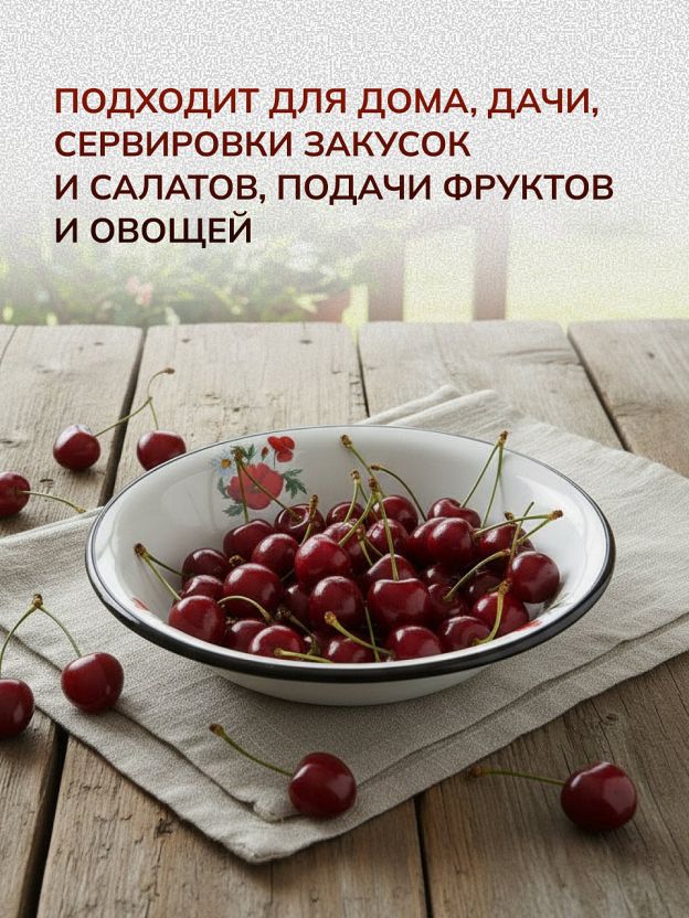 Многие спрашивают: «Как выбрать миску для дачи или пикника?» — оптимальным вариантом станет именно эмалированная модель, ведь она не боится перепадов температуры и устойчива к механическим повреждениям. В отличие от пластиковых аналогов, эмалированная сталь не впитывает запахи и легко моется. Миска не подходит для микроволновки и посудомоечной машины, но легко очищается вручную. Яркий дизайн с ягодами и цветами впишется в стиль прованс, а ассортимент расцветок позволит подобрать вариант под любой интерьер.