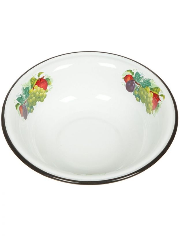 Эмалированная поверхность не впитывает запахи, устойчива к кислотам и легко моется вручную — удобно для сбора ягод, овощей, приготовления салатов или теста на даче.