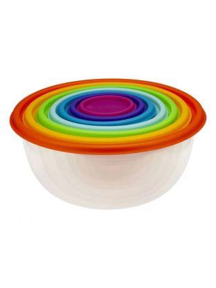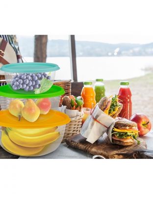 - Многоразовый набор из 7 разноцветных мисок с крышками — удобно хранить и брать с собой