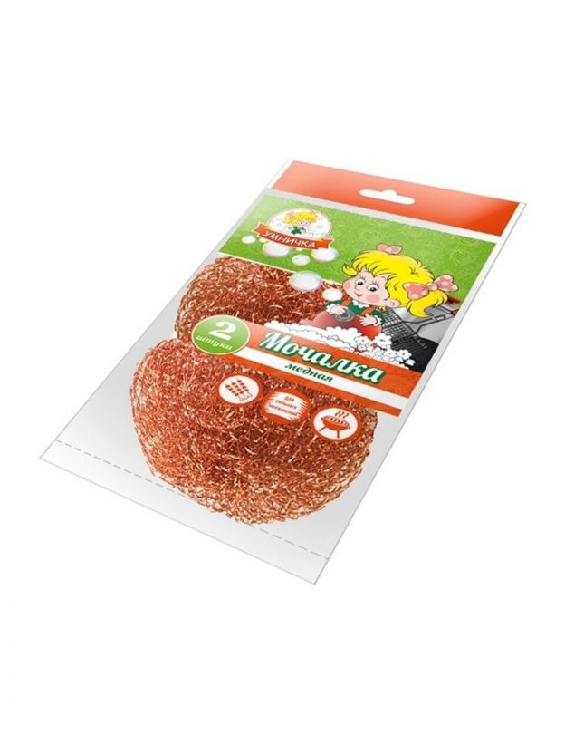 Мочалки медные "Умничка" 2шт. Наиболее прочные и долговечные, предназначены для жесткого мытья сильно загрязненной посуды. Не покрываются ржавчиной после контакта с водой. Плотное плетение волокна намного увеличивает срок службы мочалки. Волокно не ломается в процессе использования, не колет руки. Мочалка не теряет свою форму в процессе использования. Отлично вымывается водой, в ней не застревают остатки пищи. Вам будет приятно взять такую мочалку в руки даже после длительного использования.