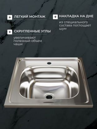 В конструкции одна чаша и одно стандартное отверстие под смеситель, что упрощает монтаж и экономит место на рабочей поверхности.