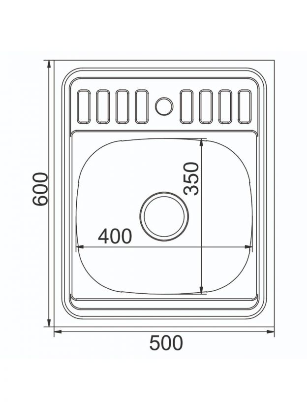 Тип — накладная, материал — нержавеющая сталь толщиной 0.6 мм, размер — 50х60 см, форма — прямоугольная, 1 чаша, 1 отверстие под смеситель, цвет — серебристый.