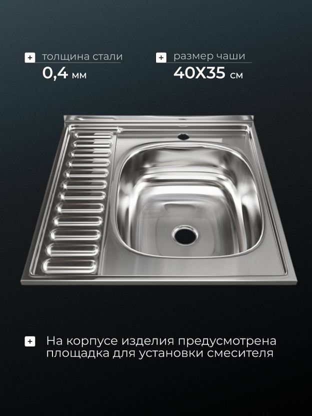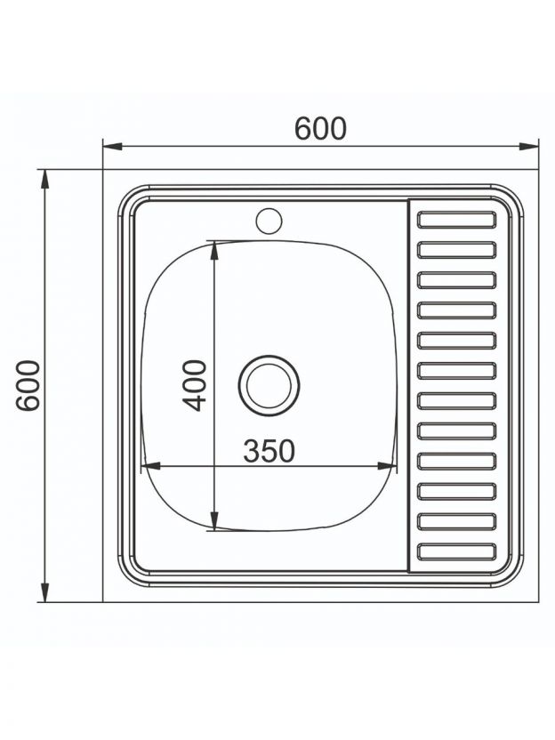 Размер мойки — 600х600 мм, материал — нержавеющая сталь толщиной 0.4 мм, форма квадратная, одна чаша, серебристый цвет.