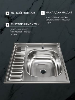 Мойка предназначена для установки на тумбу шириной 60 см, крепится сверху, не требует сложных инструментов. Есть отверстие под смеситель, крыло расположено справа.