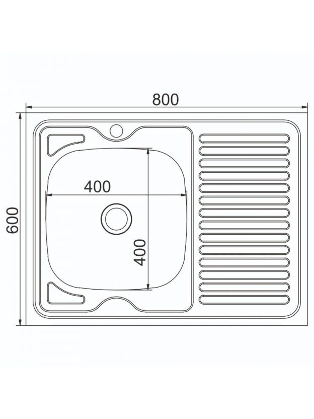Размер — 800х600 мм, материал — нержавеющая сталь, толщина — 0.6 мм, форма — прямоугольная, крыло — справа, 1 чаша, 1 отверстие под смеситель.