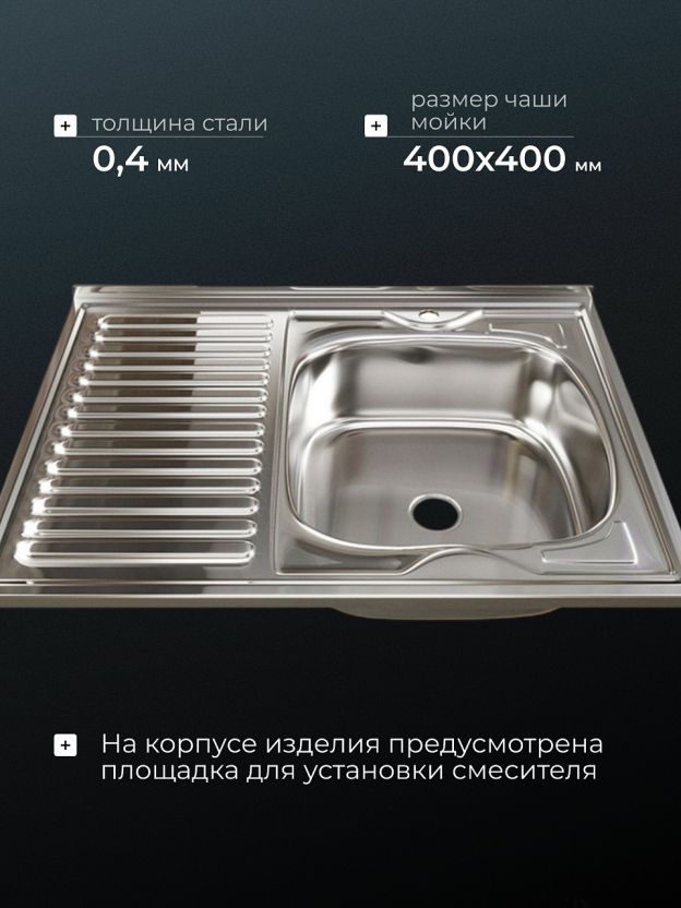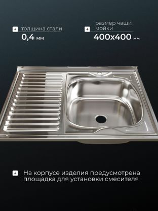 В отличие от врезных аналогов, накладная мойка быстрее монтируется и не требует специальных инструментов. Толщина стали 0.4 мм гарантирует прочность при ежедневном использовании. Если вы спрашиваете, подходит ли эта мойка для большой семьи, — её объём и просторное крыло позволяют комфортно справляться с большим количеством посуды. Для арендуемого жилья или дачного дома — это экономичное решение без лишних затрат.