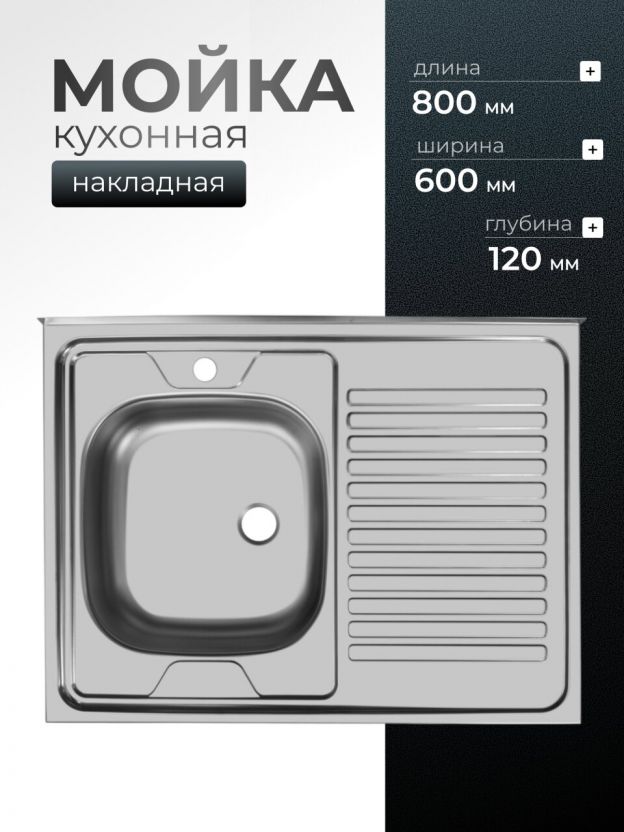 Мойка кухонная накладная, Ukinox, Стандарт, нержавеющая сталь, 800х600х120 мм, STD800.600 ---4C 0L