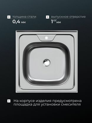 Мойка кухонная накладная, Ukinox, нержавеющая сталь, 500х500х120 мм, ECO500.500