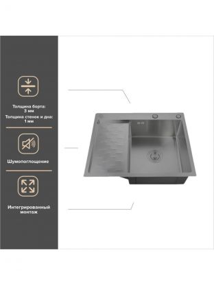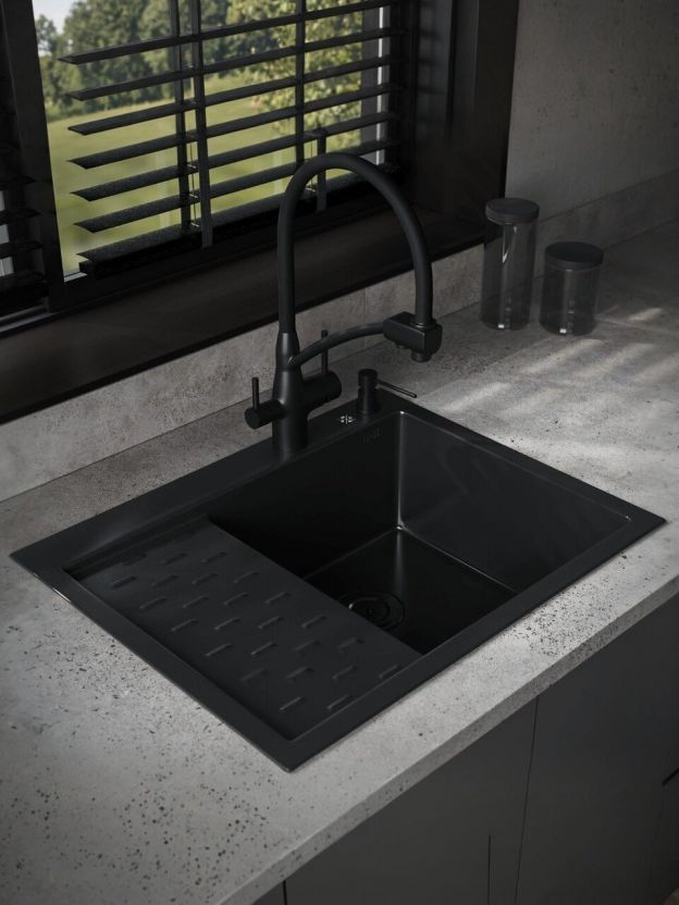 - Матовая поверхность и темный графитовый цвет придают мойке современный и элегантный внешний вид, который подходит к различным интерьерам.