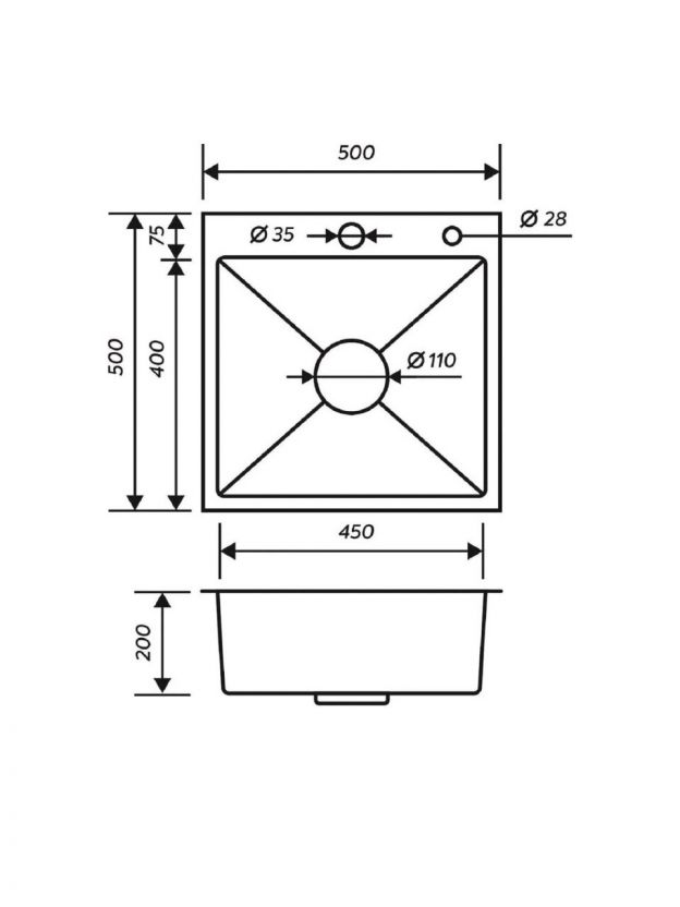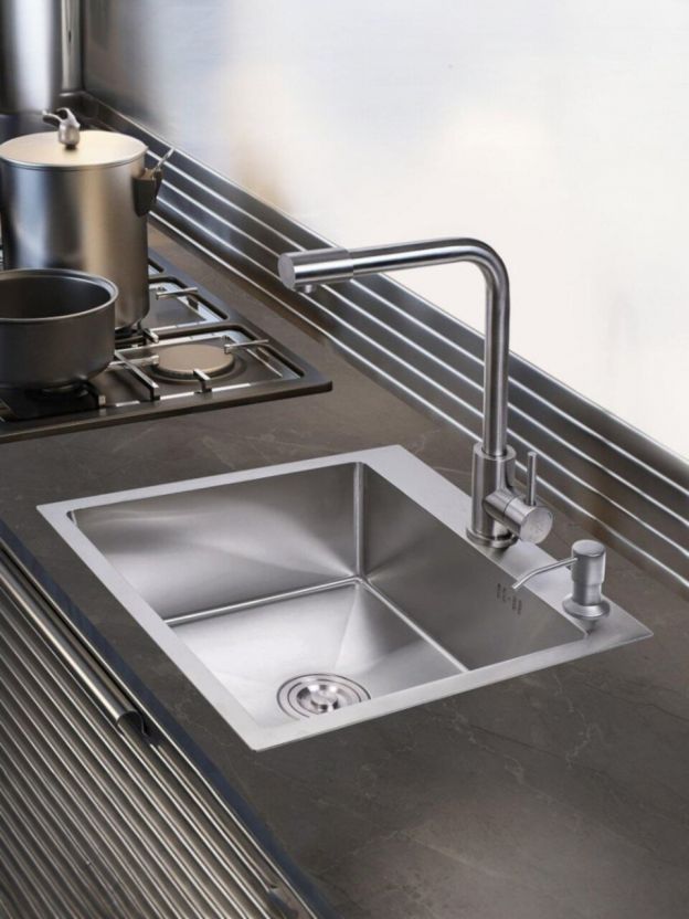 Размер мойки — 50х50 см, глубина — 20 см. Квадратная форма и отсутствие крыла делают её отличным выбором для небольших помещений, кухонь в студиях или на даче.