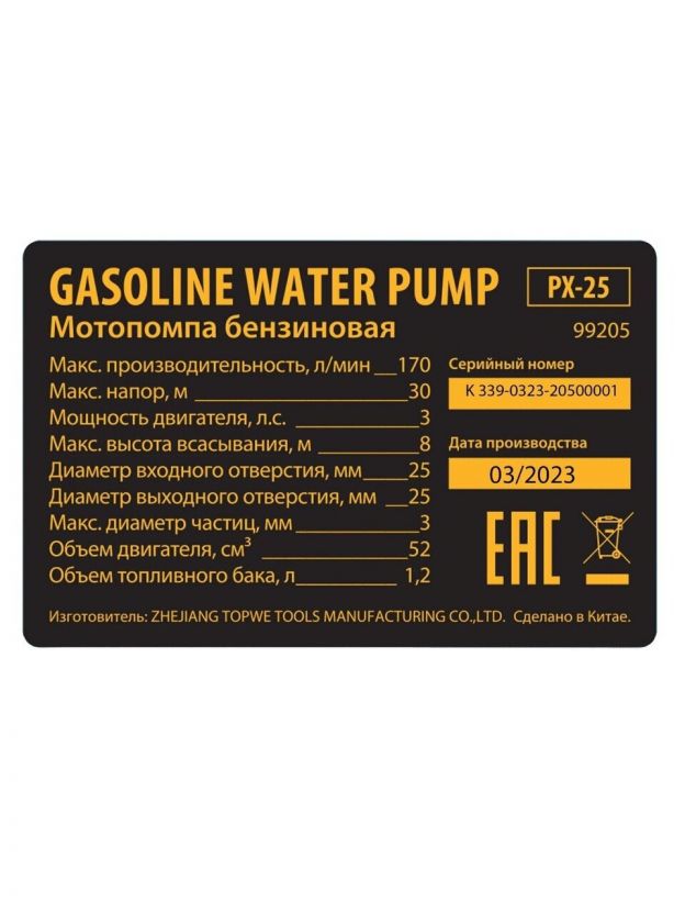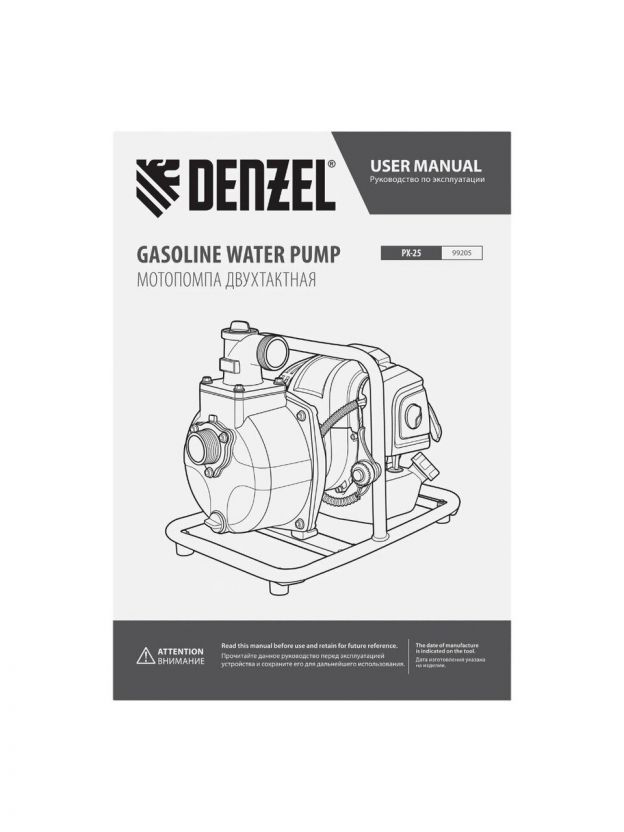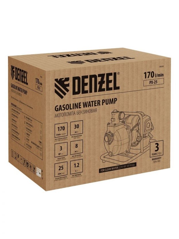 Мотопомпа бензиновая Denzel, 1 '', глубина погружения 8 м, максимальный напор 30 м, 10.2 м3/ч, 3 л.с., 170 л/мин, PX-25