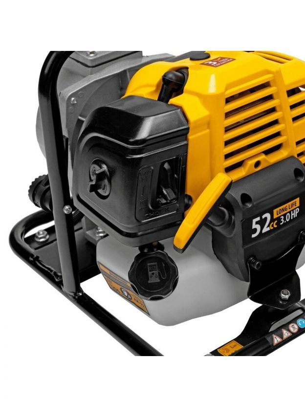 - Усиленная стальная рама с широким основанием защищает мотопомпу от повреждений и обеспечивает её устойчивость во время работы.