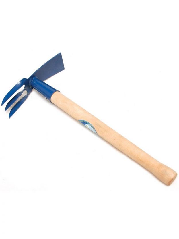Металлическая рабочая часть в порошковой окраске с деревянной ручкой. Один конец - лопатка, другой - 3 витых зубца. Подходит для прополки грядок и клумб, удаления сорняков. Усиленная конструкция позволяет дольше служить изделию. Длина черенка: 36 см.